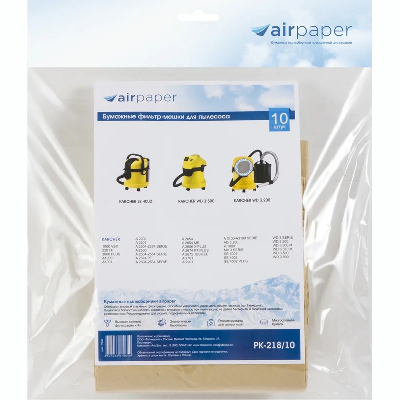 РК-218/10 Фильтр-мешки Airpaper бумажные 10 шт для пылесоса KARCHER MV 3, WD 3